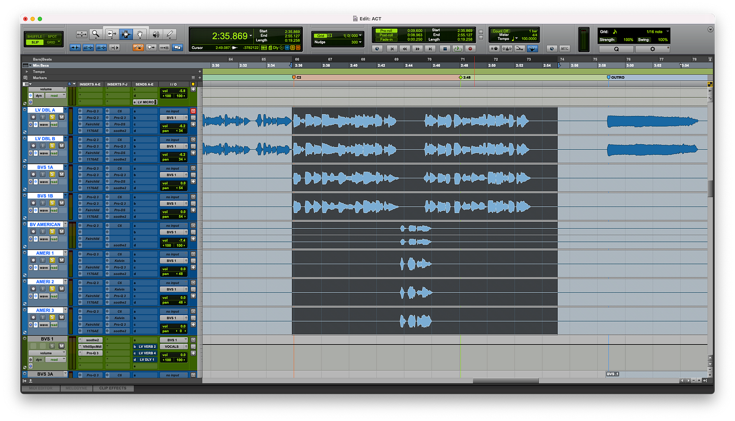 Here’s another scenario to consider: an example of a small backing vocal stack from a recent session. The pitching on these recordings was very precise, as was the timing. I applied the same concept to make them a bit more 'off,' creating a thicker choral effect. So, this tip can work both ways!