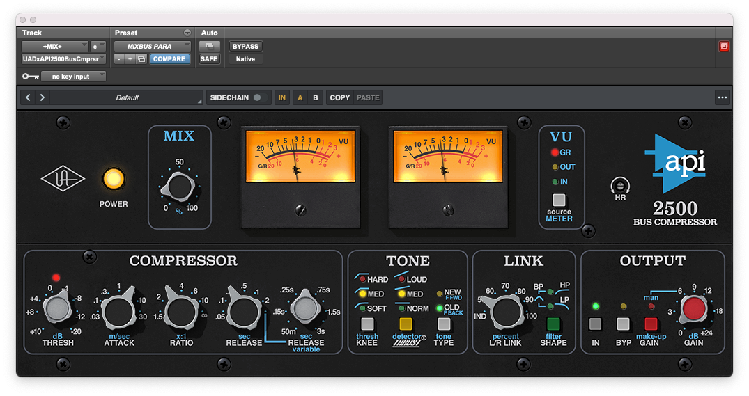 UAD API 2500 here. I’m using a very subtle blend with heavier compression settings to bring up some low-level sustain with a slower release. Leaving the channels unlinked adds a slightly modulated excitement, which feathers in a little extra width to the mix. This subtle parallel element can become a potent enhancement tool on the mix bus, particularly as an aid to deepen the front to back image.