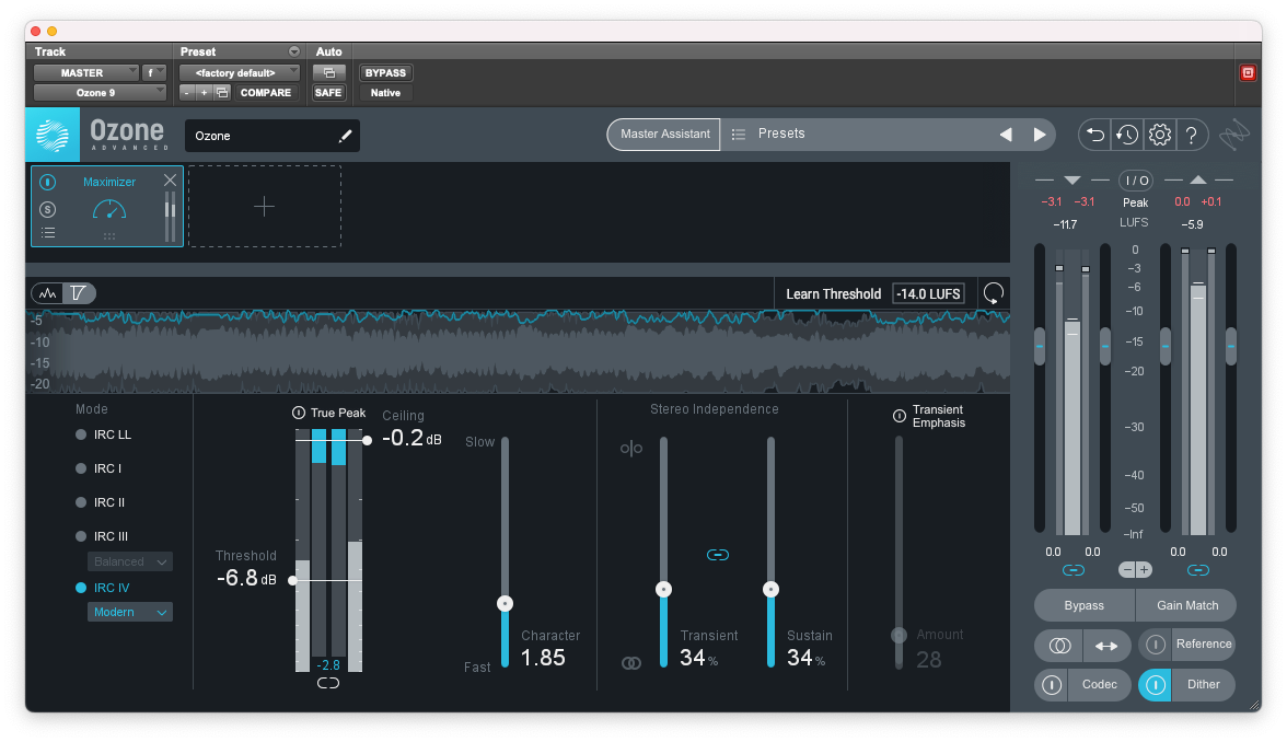 Current choice is Izotope Ozone Maximizer. I feel as though limiting a mix and making changes within a limited mix deserve a whole separate discussion. I’ll address that in further articles. For now, I’ll share my starting point using Ozone IRC IV limiting.
